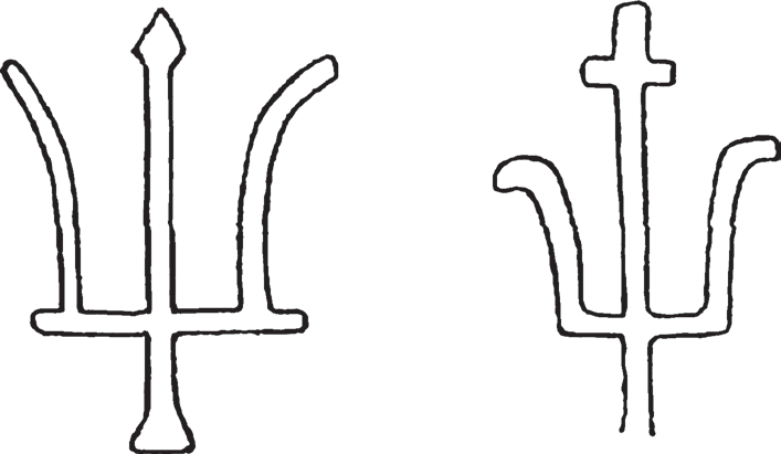 Мал. 8. Трызубцы на плінфе з царквы на рове ў Полацку, 3-я чвэрць XII ст. (паводле: Раппопорт П. А. Древнерусская архитектура. С.-Петербург, 1993. С. 252)